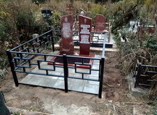 Клиент пожелал сохранить старое надгробье, а потому его мы попросту переустановили, параллельно с этим установив по периметру участка простую металлическую оградку. Все работы велись строго по уровню, а потому перекосы ограждения или надгробья абсолютно исключены.